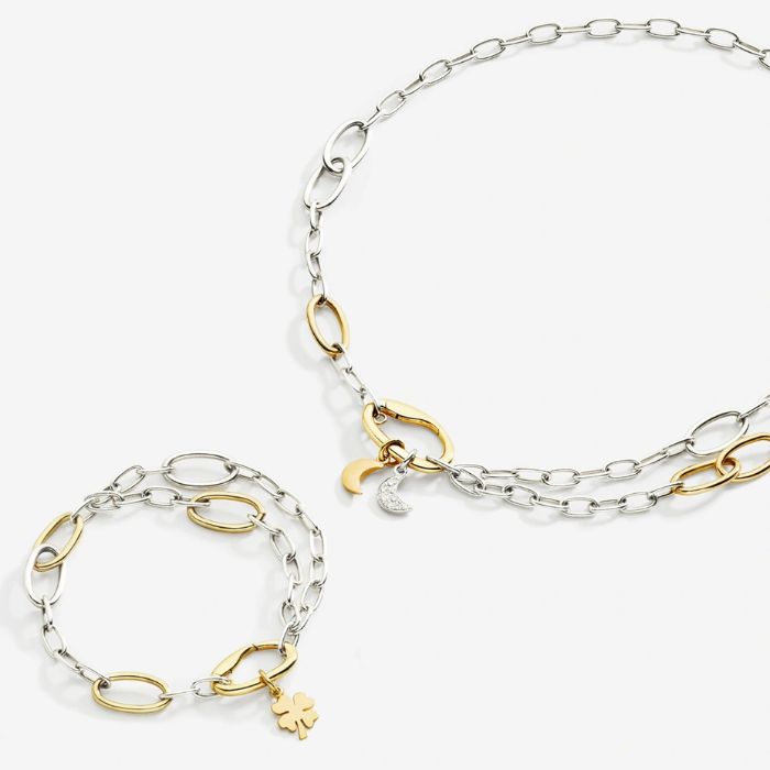Il bracciale Essentials ha maglie ovali in argento e gold – plated 18K, di diverse dimensioni. Ha una doppia catena su metà del bracciale ed una maxi clasp come chiusura che è anche porta charms.