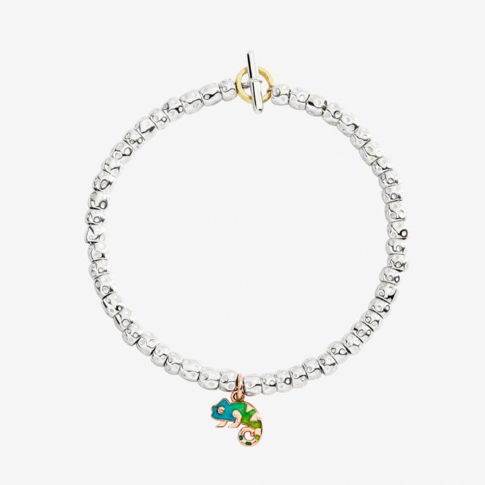 Sembra incedere cautamente il nuovo ciondolo camaleonte in oro rosa 9 K e smalto con dettagli a rilievo, occhi, zampe e coda arricciata. Lo smalto perlato, applicato a mano in tre tonalita’ di verde, sfuma a partire dalla testa fino all’estremità della coda.