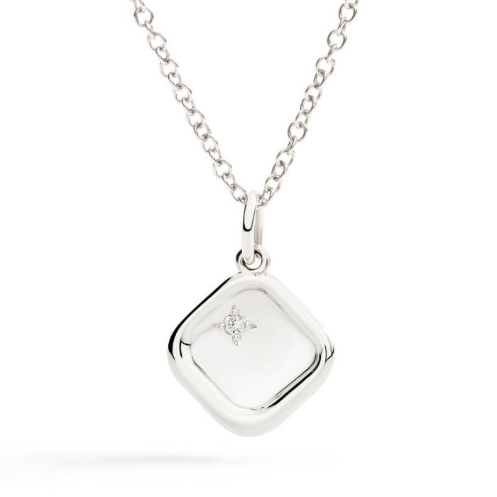 Il ciondolo Sigillo si presenta in due forme essenziali e simboliche: il quadrato e l’ovale. La versione in argento, quadrata, è impreziosita da un delicato accento di diamante. Pensato per essere indossato singolarmente o abbinato in composizioni originali e personali, il nuovo ciondolo dà vita a narrazioni sempre nuove, fluide e versatili, proprio come chi lo sceglie.
